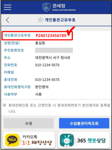 5. 개인통관번호 확인: 발급 완료 후 P로 시작하는 13자리의 개인통관번호를 확인합니다.