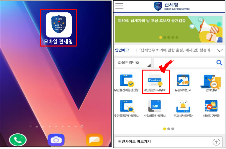 1. "모바일 관세청" 앱 설치: 플레이스토어 또는 앱스토어에서 "모바일 관세청"을 검색하여 앱을 다운로드 받습니다.