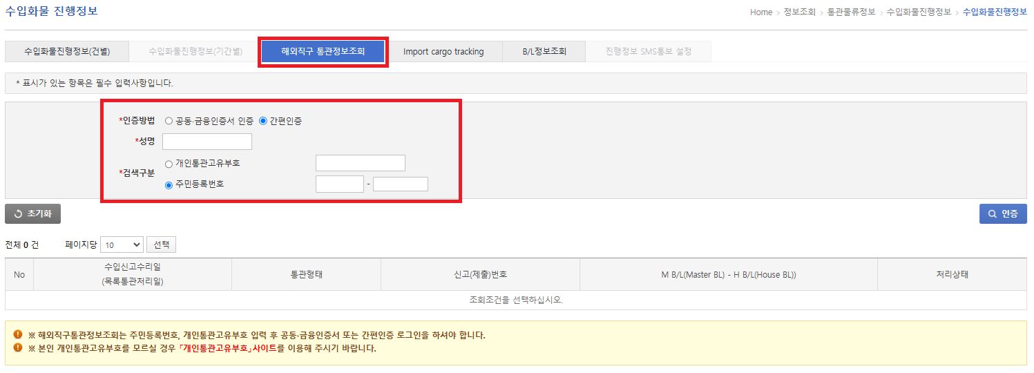 2. "해외직구 통관정보 조회" 클릭: 사이트 접속 후 "해외직구 통관정보 조회" 버튼을 클릭합니다.