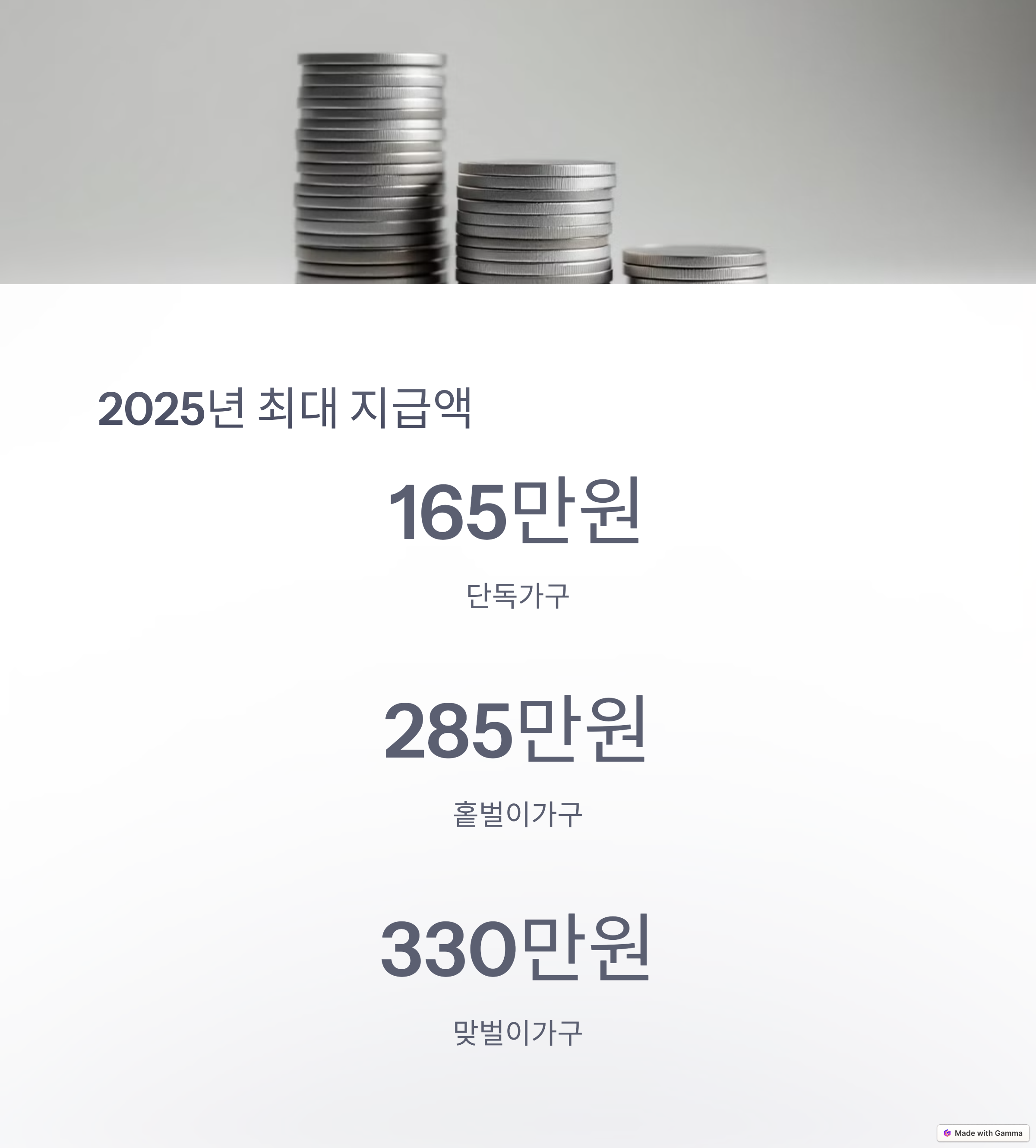 - 단독가구: 연 소득 2,200만 원 미만 → 최대 165만 원